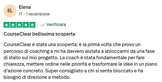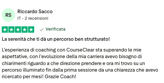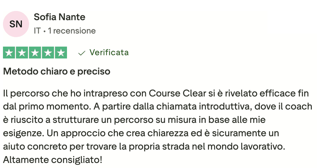 Course Clear è un servizio di accompagnamento professionale One to One che unisce orientamento e sviluppo professionale e Skill Mentoring. Non vendiamo corsi registrati né lezioni di gruppo: lavoriamo solo con te, sulla tua situazione specifica, per portarti a un obiettivo concreto. Che sia chiarire la direzione in carriera, cambiare lavoro, acquisire una competenza che ti manca o costruire un piano per uscire da una situazione che non ti soddisfa più.